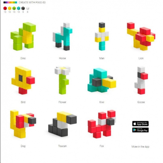 Každý produktový balík PIXIO obsahuje bezplatný kód, ktorý vám umožní prístup k exkluzívnemu obsahu aplikácie. Stiahnite si aplikáciu z Google Play alebo APP Store a preskúmajte viac ako 1000 nápadov, ako vytvoriť pixelové objekty a 3D tvary.
