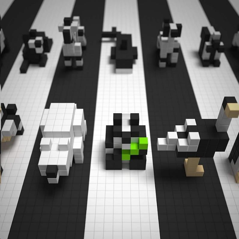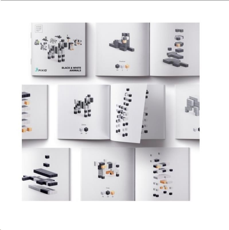 Dizajnová séria PIXIO BLACK AND WHITE Animals obsahuje 195 PIXIO blokov v 4 farbách. Umožňuje