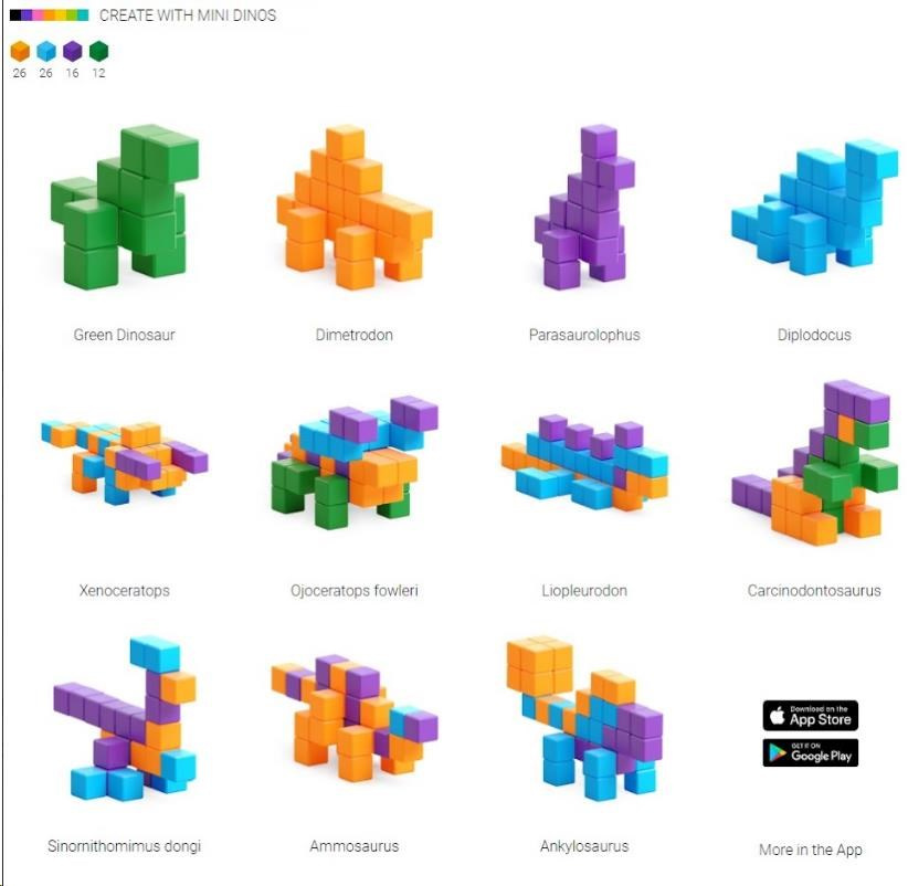 Séria PIXIO Mini Dinos obsahuje 80 blokov PIXIO v 4 farbách. Oživte svoje kreatívne nápady a