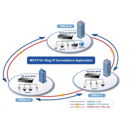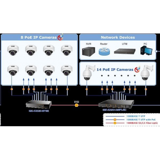 Gigabitový spravovateľný prepínač IPv4/IPv6 s portami PoE (napájanie cez ethernet) na centralizované napájanie zariadení cez ethernet, ako sú IP kamery, prvky WiFi alebo telefóny VOIP. Zariadenie je vhodné na inštaláciu do kancelárskych alebo prezentačných priestorov. Je vhodný aj pre aplikácie v lokálnych rozvádzačoch, vzdialené pripojenie možno realizovať pomocou optických portov SFP. Šifrovaná webová správa alebo protokol SNMP zabezpečujú bezpečnú správu. Pripojenia koncových používateľov môžu byť zabezpečené pravidlami ACL/MAC alebo možnou autorizáciou na serveri RADIUS/TACACS. Vlastnosti: - 8 portov 1000Base-T, prepínanie, plný duplex (1000/2000 Mb/s), automatické vyjednávanie (10/100/1000 Mb/s) - kovové porty so zabudovaným injektorom PoE 802.3af, každý injektor do 30 W/port; celkový max. napájanie až 120 W - 2x SFP, 100/1000Base-X, pre inštaláciu optických modulov mini-GBIC s označením MFB a MGB - Auto-MDI/MDI-X, automatická detekcia priameho kríženia kábla aj pre 10/100 Mbps - 8k MAC adries, 4,1Mb buffer - priepustnosť: 20Gbps zbernica, 14,88Mp/s rýchlosť prenosu dát (64B) - podpora prenosu 10KB Jumbo rámcov - správa: WEB / SNMPv3 / telnet / konzola, s podporou zabezpečenia SSH/SSL - plná podpora IPv4 a IPv6 - VLAN IEEE 802.1Q, až 256 skupín, až 4094 VLAN ID, protokolové VLAN, VoIP VLAN - LACP agregácia portov 802.3ad, až 8 skupín - QoS 8 front, klasifikácia podľa prevádzky, vážený priemer, značka VLAN alebo 802.1p flag - Spanning tree protokol: STP / RSTP / MSTP - IGMPv3 Snooping, Querier, až 256 multicast skupín - Port mirroring- zrkadlenie portov: TX / RX / TX+RX / viac portov na jeden - Client security: access control list (ACL), MAC static table for authorized devices, RADIUS/TACACS+ authorization, DHCP snooping - Ochrana proti DoS útokom - Tepelná ochrana proti prehriatiu - ESD ochrana proti elektrostatike do 2kV DC - Rozmery: (330 x 155 x 44,5))mm; hmotnosť 1,7kg - Prevádzková teplota: 0-50°C - Interný AC zdroj 100-240V/50-60Hz, vlastný výkon do 30W..