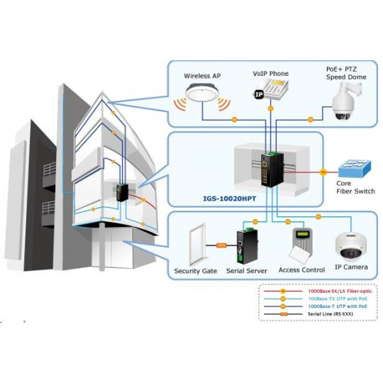 Planet IGS-10020HPT PoE switch 8x 1000Base-T, 2x SFP, 802.3at 270W, IP30, -40 až 75°C, SNMP, IGMPv3, IPv6 Inteligentné prepínače pre priemyselný Ethernet sú určené do náročných prevádzkových podmienok so širokým rozsahom prevádzkových teplôt, neistým napájaním a častými otrasmi. Zároveň poskytujú vynikajúce možnosti viacnásobného prepojenia na dosiahnutie robustného prepojenia systému s veľmi nízkym časom obnovy. IGS-10020HPT je vybavený pre redundanciu okrem známej metódy Spanning Tree (ktorej čas obnovy sa pohybuje v sekundách) najmä špecializovanou funkciou "Redundant ring", ktorá má čas obnovy a nájdenia novej cesty do 300 ms. Ako prepínač PoE môže priamo napájať až 8 zariadení IEEE 802.3at, a preto je ideálny pre aplikácie so zníženou dostupnosťou energie. Prepínače radu IGS sa ľahko inštalujú na štandardnú lištu DIN alebo priamo na stenu a umožňujú nasadenie známej technológie Ethernet aj v priemyselnom prostredí. Sú vhodné aj na inštaláciu vo vonkajších krytoch s veľkými výkyvmi prevádzkových teplôt (typicky bezdrôtové aplikácie a aplikácie MAN ISP). Vlastnosti: - 8 portov 1000Base-T, prepínanie, plný duplex (1000/2000 Mb/s), automatické vyjednávanie (10/100/1000 Mb/s), automatická detekcia priameho/krížového kábla na každom porte - pre všetky PoE IEEE 802.3at injektory so zaťažiteľnosťou 30 W/port, spolu až 270 W - 2 porty SFP na inštaláciu modulov 1000Base-SX/LX/BX alebo 100Base-FX - Priepustnosť: zbernica 20 Gb/s, 14,8 Mp/s (64B) - Podpora Jumbo Frame do 9 kB, 8k MAC adries, 4Mbitová vyrovnávacia pamäť - 255 VLAN IEEE 802.1Q, siete založené na MAC alebo protokole VLAN, VoIP VLAN - port trunking IEEE 802.3ad LACP - IGMP v1,v2,v3 až do 256 multicast skupín, režim IGMP querier - 8-úrovňová prioritizácia prevádzky QoS podľa portov, DSCP/ToS, 802.1p alebo 802.1Q tagy - podpora Spanning Tree IEEE 802.1d, Rapid Spanning Tree IEEE 802.1w - IP/MAC ACL (access control list) do 123 pravidel, MAC/IP binding - DHCP snooping - port shaper - administrace Web/SNMPv3 s podporou zabezpečeného přenosu SSH/SSL - podpora IPv4/IPv6 - PoE scheduler pro možnost zapínání/vypínaní napájení podle časového plánu - pole LED indikátorů pro diagnostiku provozu - instalace na DIN lištu, montážní díl součástí - instalace na zeď, montážní díl součástí - krytí IP30 - napájení: 48V DC redundantní, připojení možné ze dvou různých zdrojů (nejsou součástí balení); vlastní příkon do 30W - ochrana proti přepólování, připojení napájení na svorkovnici, umístění na spodním panelu (nepřekáží při montáži na zeď) - přepěťová ochrana napájení do 6kV proti napěťovým špičkám (EFT) - přepěťová ochrana LAN portů do 6kV proti elektrostatickému náboji (ESD) - spínací poplachové relé (24V/1A) při výpadku primárního napájení - zařízení je odolné proti pádu (IEC-60068-2-32) z výšky 7.