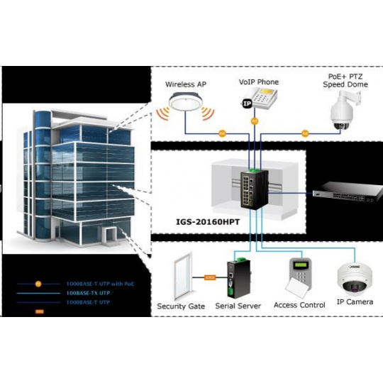 Planet IGS-20160HPT, 18x 1000BASE-T, 16x PoE 320W, 2x SFP, DIN, IP30, -40 AŽ 75°C, WEB/SNMPV3 IIinteligentné prepínače pre priemyselný Ethernet sú určené do náročných prevádzkových podmienok s veľkým rozsahom prevádzkových teplôt, neistým napájaním a častými otrasmi. Zároveň poskytujú vynikajúce možnosti viacnásobného prepojenia na dosiahnutie robustného prepojenia systému s veľmi nízkym časom obnovy. IGS-20160HPT je vybavený na redundanciu okrem známej metódy Spanning Tree (ktorej čas obnovy sa pohybuje v sekundách) predovšetkým špecializovanou funkciou ERPS (Ethernet Ring Protection Switching), ktorá má čas obnovy a nájdenia novej cesty do 50 ms. Podporované je statické smerovanie L3 až pre 32 pravidiel a 128 rozhraní VLAN. Prepínače radu IGS sa ľahko inštalujú na štandardnú lištu DIN alebo priamo na stenu a umožňujú nasadenie známej technológie Ethernet aj v priemyselnom prostredí. Sú vhodné aj na inštaláciu vo vonkajších krytoch s veľkými výkyvmi prevádzkových teplôt (typicky bezdrôtové aplikácie a aplikácie MAN ISP). Ich veľkou výhodou je predĺžená MTBF! Sieťové funkcie: - 18 portov 1000Base-T, prepínanie, plný duplex (1000/2000 Mb/s), automatické vyjednávanie (10/100/1000 Mb/s), automatická detekcia priameho/krosového kábla na každom porte - 16 portov PoE injektory IEEE 802.3at se zatížitelností 30W/port; celkově až 320W při duálním napájení, při jednoduchém napájení výkon do 260W - 2 porty SFP pro instalaci modulů 1000Base-SX/LX/BX nebo 100Base-FX, sdílené s metalickými porty 17-20, podpora SFP-DDM (Digital Diagnostic Monitor) - 1x sériová konzole, RJ-45 - propustnost: sběrnice 40Gbps, provozně 29,7Mp/s(64B) - podpora přenosu Jumbo Frame do 9kB, 8k MAC adres, buffer 4MBits - správa přepínače Web/SNMPv3/konzole s podporou zabezpečeného přenosu SSH/SSL - alarm email ve spojení s I/O a stavem linek - podpora TCP IPv4/IPv6 - L3 statické routování, až 32 pravidel a 8 VLAN rozhraní - 255 VLAN IEEE 802.1Q, siete založené na MAC alebo protokole VLAN, VoIP VLAN - port trunking IEEE 802.3ad LACP, až 10 skupín po 8 portoch - IGMP v1,v2,v3 až 256 multicastových skupín, režim IGMP querier - 8-úrovňová prioritizácia prevádzky QoS podľa portov, DSCP/ToS, 802.1p alebo 802.1Q tagy - port shaper v rozsahu 500kb-1000Mb/s - IEEE 802.1d Protokol Spanning tree, IEEE 802.1w Protokol Rapid spanning tree, IEEE 802.1s Protokol viacnásobného rozprestierajúceho sa stromu - "E.R.P.S ring" pre kruhovú topológiu s časom obnovy <50 ms- IP/MAC ACL (zoznam riadenia prístupu) až do 256 pravidiel - IEEE 802.1x (RADIUS) - Väzba IP+MAC, VLAN+MAC, 256 pravidiel - Zrkadlenie portov: TX/RX/RX+TX, viac portov na port - DHCP snooping na potlačenie nežiaducich serverov v sieti - IEEE 802.1ab LLDP: automatická detekce typu připojených zařízení - diagnostika kabeláže, stanovuje délku kabeláže a případnou vzdálenost k závadě - podpora MODBUS protokolu (platí pro poslední verzi firmware)  Fyzické vlastnosti: - napájení: duálně DC 48~56V, připojení není nutné ale je doporučené ze dvou různých zdrojů (nejsou součástí balení) - vlastní příkon <11W- I/O digitální rozhraní: 2x vstupy + 2x výstupy, terminálový blok - spínací poplachové relé (24V/1A) při výpadku primárního napájení - instalace na DIN lištu nebo na zeď, montážní díl součástí - krytí IP30 - pole LED indikátorů pro diagnostiku provozu - ochrana proti přepólování, připojení napájení na svorkovnici, umístění na spodním panelu (nepřekáží při montáži na zeď) - přepěťová ochrana LAN portů proti elektrostatickému náboji do 6kV (ESD) - zařízení je odolné proti pádu (IEC-60068-2-32) z výšky 75cm na všechny dopadové části - zařízení je odoln.