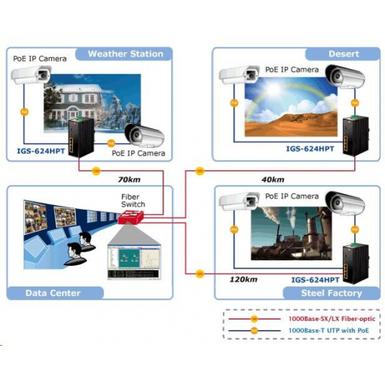 Planet IGS-624HPT, PoE switch 4x 1000Base-T, 2x SFP 100/1000Base-X, 802.3at 120W, DIN, IP30, -40 až +75st.C Priemyselné ethernetové prepínače sú určené do náročných prevádzkových podmienok so širokým rozsahom prevádzkových teplôt, neistým napájaním a častými otrasmi. Verzie série spínačov s rozšíreným teplotným rozsahom. Prepínače radu IGS sa ľahko inštalujú na štandardnú lištu DIN alebo priamo na stenu a umožňujú nasadenie známej technológie Ethernet aj v priemyselnom prostredí. Sú vhodné aj na inštaláciu vo vonkajších krytoch s veľkými výkyvmi prevádzkových teplôt (typicky bezdrôtové aplikácie a aplikácie MAN ISP). Ako prepínač PoE môže priamo napájať až 4 zariadenia IEEE 802.3at, a preto je ideálny pre aplikácie so zníženou dostupnosťou energie. Vlastnosti: - 4x 1000Base-T, prepínanie, plný duplex (1000/2000 Mb/s), automatické vyjednávanie (10/100/1000 Mb/s), automatická detekcia priameho/krosového kábla na každom porte - PoE IEEE 802.3at injektory so zaťažiteľnosťou 30 W/port, celkovo až 120 W - 2x SFP 100-FX / 1000Base-X na inštaláciu mini-GBIC modulov, zdieľané porty s 5 a 6 TP portmi - priepustnosť: zbernica 12 Gb/s, prevádzkovo 8.93Mp/s(64Bajtov) - 1k MAC adries, MTU max. 9216Bajtů - DIP přepínače pro nastavení práce portů, LED indikátory stavu provozu - instalace na DIN lištu, montážní díl součástí - instalace na zeď, montážní díl součástí - krytí IP30 - napájení: 48V DC redundantní, připojení možné ze dvou různých zdrojů (nejsou součástí balení); vlastní příkon do 15W - ochrana proti přepólování, připojení napájení na svorkovnici, umístění na spodním panelu (nepřekáží při montáži na zeď) - přepěťová ochrana napájení do 6kV proti napěťovým špičkám (EFT) - přepěťová ochrana LAN portů proti elektrostatickému náboji do 6kV (ESD) - zařízení je odolné proti pádu (IEC-60068-2-32) z výšky 75cm na všechny dopadové části - zařízení je odolné proti vibracím (IEC-60068-2-6) 10-500-10Hz, 4x g, 0,5oct/min - zařízení je odolné proti přetížení krátkodobému zrychlení 50g, dlouhodobému 4g, (IEC-60068-2-27) - EMI/EMS, elektromagnetická kompatibilita a slučitelnost dle CE EN-6100-4-2,3.