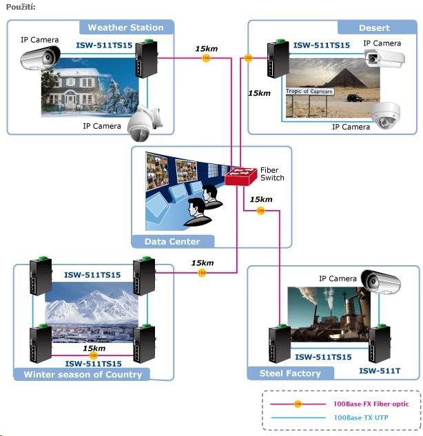 Planet ISW-511T, 4x 10/100Base-TX+ 1x 100FX 2km, MM, DIN, IP30, -40~75°C Priemyselné ethernetové prepínače sú určené do náročných prevádzkových podmienok so širokým rozsahom prevádzkových teplôt, neistým napájaním a častými otrasmi. Prepínače radu ISW sa ľahko inštalujú na štandardnú lištu DIN alebo priamo na stenu a umožňujú nasadenie známej technológie Ethernet aj v priemyselnom prostredí. Sú vhodné aj na inštaláciu vo vonkajších krytoch s veľkými výkyvmi prevádzkových teplôt (typicky bezdrôtové aplikácie a aplikácie MAN ISP). Vlastnosti: - 4 porty 100Base-TX, prepínanie, plný duplex (100/200 Mb/s), automatické vyjednávanie (10/100 Mb/s), automatická detekcia priameho/krosového kábla na každom porte - 1 port 100Base-FX, plný duplex, konektory SC, multimodemový, pre vlákna 50/125um a 62,5/125um, dosah 2 km, vlnová dĺžka 1300 nm, zdvih min. 15,5 dB (vysielací výkon max. -14dBm, min. -19dBm, citlivosť príjmu -34,5dBm) - 1M vyrovnávacia pamäť, priepustnosť zbernice 1Gbps, 0,74Mpps (64B), tabuľka 2k MAC adries - sústava LED indikátorov pre diagnostiku prevádzky - montáž na DIN lištu, montážny diel je súčasťou dodávky - montáž na stenu, montážny diel je súčasťou dodávky - krytie IP30, celohliníkový kryt - napájanie: 12-48V DC redundantné, možnosť pripojenia z dvoch rôznych zdrojov (nie sú súčasťou dodávky) - ochrana proti prepólovaniu, pripojenie napájania na svorkovnici, umiestnenie na spodnom paneli (neprekáža pri montáži na stenu) - prioritizácia prevádzky QoS podľa portov, ToS, 802.1p - zariadenie je odolné voči pádu (IEC-60068-2-32) z výšky 75 cm na všetky nárazové časti - zariadenie je odolné voči vibráciám (IEC-60068-2-6) 10-500-10Hz, 4xg, 0,5okt/min - zariadenie je odolné voči preťaženiu krátkodobé zrýchlenie 50g, dlhodobé 4g, (IEC-60068-2-27) - EMI/EMS, elektromagnetická kompatibilita a kompatibilita podľa CE EN-6100-4-2,3,4,5,6 - elektrická bezpečnosť podľa CE EN-60950 - pracovná teplota -40 až 75°C, vlhkosť do 95% - spotreba energie do 14W - rozmery: 135 x 97 x 32 mm - hmotnosť: 436g..