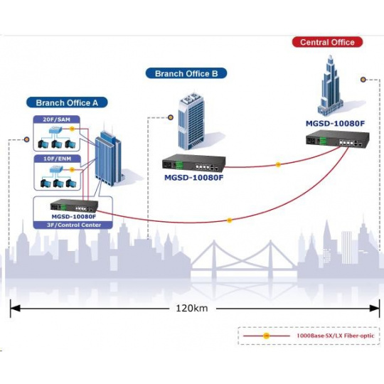 Spravovaný viacportový optický prepínač SFP navrhnutý pre rozsiahle siete, telekomunikácie a aplikácie ISP alebo IPTV. Vďaka svojej fyzickej a odolnej konštrukcii je vhodný na priamu inštaláciu do smerových alebo koncových skríň. Zariadenie pracuje v teplotnom rozsahu od -10 do 60 °C, môže byť napájané redundantne, má digitálne I/O rozhranie a všetky porty sú prístupné z predného panela. Prepínač možno spravovať prostredníctvom protokolov IPv4 a IPv6, SNMPv3 a bezpečne na šifrovanej vrstve SSL/SSH. Medzi funkcie patrí integrácia do dátových centier alebo pripojenie a zabezpečenie prevádzky koncových používateľov, riadenie prevádzky na základe QoS, filtrovanie a autorizácia prístupov prostredníctvom zoznamu ACL (Access Control List), aktivácia fyzického portu na základe autentifikácie na serveri RADIUS pomocou IEEE 802.1x. Vlastnosti 8x 100/1000Base-SX/LX/BX/FX SFP rozhraní, podpora SFP-DDM (Digital Diagnostic Monitor) 2x 1000Base-T, Switching, Full Duplex (1000/2000 Mbps), Auto-Negotiation (10/100/1000 Mbps), sdílených s SFP porty Plná podpora protokolu IPv6/IPv4 8k MAC adres, sdílený buffer 4Mbit Propustnost: sběrnice 20Gbps, 14,8Mp/s(64B) Podpora přenosu Jumboframe 9KB Provedení rackmount, rozměry (330 x 155 x 43,5)mm, hmotnost 1,6kg, 1U výška Napájení: duálně AC 100~240V/50Hz; DC -36V až -72V; příkon do 11W 2x digitální vstupy (zátěž 10mA)+2x výstupy(zátěž 100mA), úrovně 0-24V Provozní teplota: -10 až 60°C Administrace Web/Telnet/konzole/SNMP s možností zabezpečeného přístupu SSH/SSL SNMP v1,v2c,v3 Funkce administrace nastavení režimu fyzické práce portů 255 sítí VLAN 802.1Q, trunking, možnosť nastaviť vstupný filter VLAN tagged/untagged paketov IP ACL, filtrovanie prevádzky podľa IP adresy, protokolu, portu, TCP príznakov, DSCP MAC ACL, filtrovanie prevádzky podľa MAC adresy, podľa VLAN ID a kombinácie príznakov priority Port shaper - nastavenie v rozsahu 500kb/s-1Gb/s QoS prioritizácia prevádzky podľa 802.1p a podľa ToS/DSCP v IP pakete, možnosť nastaviť obmedzenie odosielaných paketov na port a podľa pravidiel QoS Podpora IP multicast, IGMP, možnosť ovládať multicast priamo prepínačom (zapnúť/vypnúť multicast), IGMP v1/v2/v3; režim IGMP Query Zrkadlenie portov Port trunking IEEE 802.3ad LAPC: 5 skupín, max. 8 portov Spanning Tree IEEE 802.1d, Rapid Spanning Tree IEEE 802.1w, viacnásobný rozprestierajúci sa strom IEEE 802.1s IEEE 802.1x RADIUS - viazanie IP+MAC, VLAN + MAC DHCP Snooping na blokovanie nevhodných DHCP serverov LLDP IEEE 802.1ab - automatická detekcia typu pripojených zariadení..