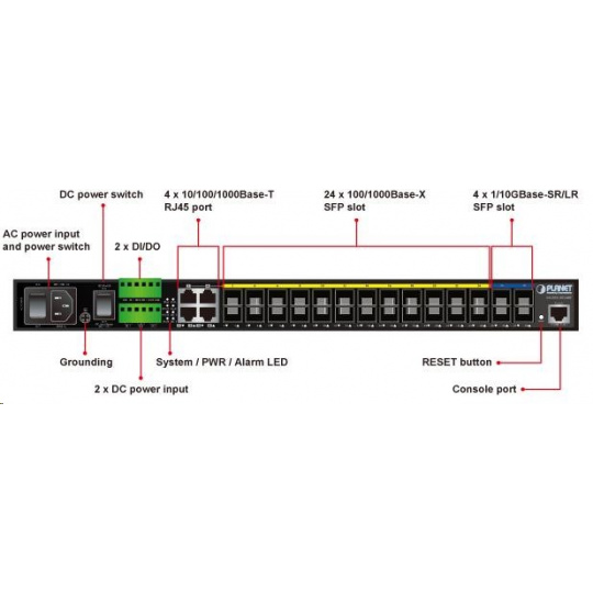 Planet MGSW-28240F Metro switch 24x SFP(DDM), 4x SFP+, 4x TP, AC+DC, DI/O, Web/SNMPv3, IGMPv3, IPv6