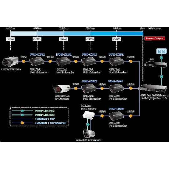Riešenia na rozšírenie segmentu Ethernet vrátane rozšírenia rozsahu napájania cez ethernet (PoE). Ide o jednoduché zariadenie, ktoré umožňuje predĺžiť maximálnu dĺžku ethernetového segmentu zo 100 m na 200 m alebo až na 500 m vrátane zachovania štandardu IEEE 802.3at na konci linky. Aplikácia extenderu je ideálna v mieste použitia IP kamier alebo bezdrôtových prístupových bodov pre ich dlhšie vzdialenosti pripojenia. Ide o nízkonákladové rozšírenie možnosti inštalácie napájaných zariadení na miestach vzdialenejších od centrálneho prepínača alebo rozvádzača. Použitie spočíva v jednoduchom nasadení nástavca na prerušenú linku. - rozhranie 10/100/1000 Base-T s rozhraním IEEE 802.3at/802.3af PoE, Auto MDI/MDI-X, Auto-Negotiation, RJ-45 - Priepustnosť: až 1488000 paketov/s - Maximálna dĺžka rámca: 1552 bajtov - Prepäťová ochrana: do 2 kV - Rozmery: 94 x 70 x 26 mm - Hmotnosť: 197 g - Napájanie: PoE 802.3at na vstupe extenderu, vlastný výkon do 3,2 W - FCC (časť 15, trieda A), CE - prevádzková teplota: -10 až 60°..