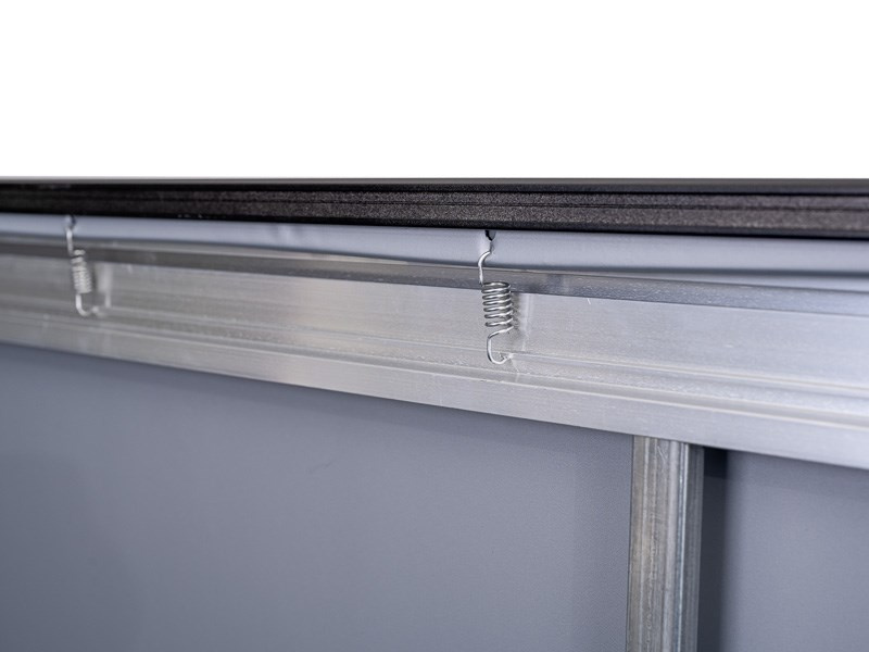 Rám plátna je potiahnutý čiernym semišom pre pohltenie okolitého svetla a zvýraznenie farieb projekcie.