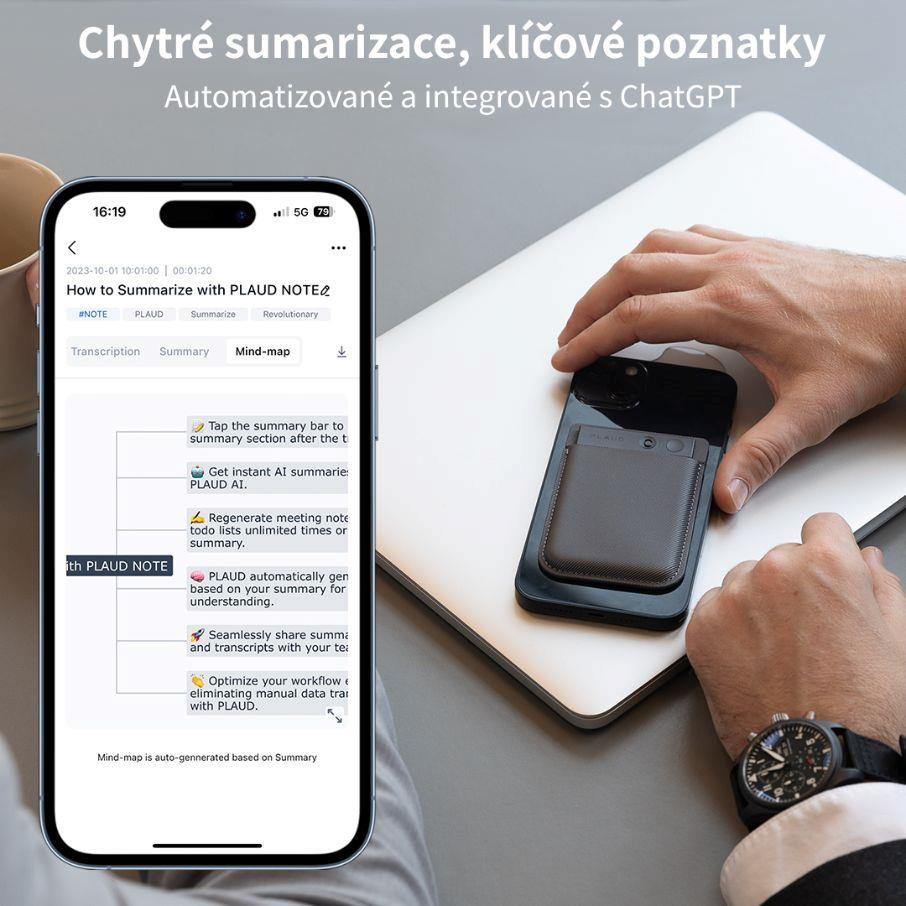 Plaud Note je AI hlasový záznamník, ktorý vám s pomocou ChatGPT nástrojov podstatne uľahčí život. Záznamník má minimalistický dizajn ocenený cenou Red Dot za výnimočný dizajn a minimalistické sú aj jeho rozmery – je veľký ako platobná karta. Záznamník podporuje 57 jazykov vrátane češtiny a slovenčiny. Plaud Note ponúka duálny režim nahrávania, a to pre diktovanie poznámok a druhý pre nahrávanie hovorov. Vďaka zabudovanému 64GB úložisku môžete na Plaud Note nahrať až 480 hodín záznamu a jeho energetická nenáročnosť zabezpečí 30 hodín kontinuálneho záznamu a 60 dní pohotovostného režimu. Absolútne výnimočné je u osobných záznamníkov prepojenie Plaud Note s ChatGPT. Vďaka aplikácii Plaud môžete nechať nadiktované záznamy prepísať, tvoriť z nich súhrny, a dokonca nechať AI vytvoriť, dnes veľmi populárne, myšlienkové mapy. V cene produktu je navyše zahrnuté cloudové úložisko pre 10 000 minút záznamu. Služba PLAUD AI Membership má dve varianty. Starter a Pro. Starter ponúka takmer všetky funkcie, obsahuje 300 minút transkripcie záznamu a je zadarmo. Verzia Pro ponúka 1200 minút prepisu, rozšírený výber šablón, a navyše prioritný prístup k chystaným funkciám, ako je napríklad rozpoznanie osoby alebo prekladač. Aktuálna cena služby Pro je 249 Kč mesačne* pri účtovaní mesačne, alebo 1990 Kč ročne*. Ďalšia z bezplatných funkcií, ktoré robia zo spolupráce s Plaud Note, je AI spracovanie, zabezpečujúce elimináciu ruchov na pozadí. Túto funkciu je možné aktívovať aj dodatočne, po vytvorení záznamu, a dá sa nastaviť v troch intenzitách pre každú príležitosť. Poznámky tak môžete v kľude diktovať aj na rušnej ulici a výsledkom bude len váš, izolovaný hlas. Záznamník sa ovláda fyzickým tlačidlom s haptickou odozvou a fyzickým prepínačom režimov. Záznam začína aj končí jediným stlačením tlačidla, tak jednoduché to je. (*cena predplatného aktuálna k 20.5.2024)