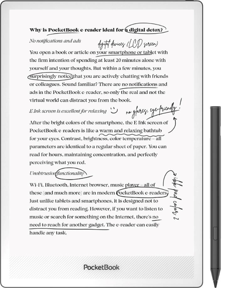InkPad One je 10,3" čtečka elektronických knih s dotykovým perem, navržená pro aktivní čtení a pohodlné psaní rukou. Zařízení je vybaveno displejem E Ink Mobius™ s papírovým vzhledem a dodává se s aktivním digitálním perem pro přirozené pořizování poznámek. Nabízí širokou škálu integrovaných nástrojů pro psaní. InkPad One je cenově dostupné řešení s velkou obrazovkou pro čtení, psaní a každodenní produktivitu.