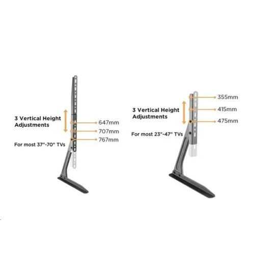 Televízne nohy s nosnosťou 50 kg, pre televízory s uhlopriečkou 37" až 65", nastaviteľná výška Stabilný televízny podstavec, univerzálny, vhodný pre všetky typy, veľkosti a značky televízorov s podporou VESA. Nastavenie výšky, nosnosť 50 kg, farba čierna, záruka 3 roky. Balenie obsahuje sadu inštalačného materiálu. Podstavec na televizi, nožky na Tv Ergosolid Castor 1 Technické údaje: nosnost 50kg podpora VESA standardů 100x100 až 800x500 doporučená úhlopříčka Tv 37" až 65" výškové nastevení 620mm až 683mm šířka podstavců 356mm protiskluzové podložky minimalistický design stabilní, bezpečný materiál ocel instalační materiál barevné provedení černé záruka 3 roky Ergosolid Castor 1 podporuje VESA standardy: VESA 100x100 VESA 200x100 a 100x200 VESA 200x200 VESA 300x100 a 100x300 VESA 300x200 a 200x300 VESA 300x300 VESA 400x200 a 200x400 VESA 400x300 a 300x400 VESA 400x400 VESA 600x400 VESA 800x400 VESA 800x500..