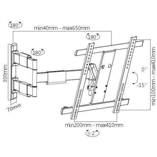 Precízny držiak na TV Fiber Mounts NICE1 Kvalitný držiak na TV 32-55", otočný +/- 90°, sklopný 0-15°, vedenie káblov, korekcia roviny, VESA 200x100 až 400x400, nosnosť 25kg Špičkový televízny držiak, ktorý má širokú škálu polohovania vo veľkom rozsahu vďaka vynikajúcej konštrukcii a precíznemu spracovaniu. Držiak Fiber Mounts NICE1 je vhodný na TV 32-55", televíziu môžete otočiť kolmo na obe strany, naklápať až o 15°, odsúvať a priťahovať ku stene od 4cm do 65cm a upraviť rovinu obrazovky. Ramena držiaka sú osadené úchyty na káble. Konštrukcia držiaka je veľmi pevná, ani pri maximálnom zaťažení 25kg nedochádza k provešeniu a nevznikajú žiadne vůle. Ovládateľnosť je veľmi jednoduchá. Výhodou tohto držiaka je aj jeho dizajnové spracovanie. Farba čierna. Záruka 5 rokov. Veľmi kvalitný a veľmi pekný televízny držiak pre ľudí, ktorým ide o kvalitu, dizajn a veľmi jednoduché polohovanie televízie - Fiber Mounts NICE1 Technické údaje: maximálne zaťaženie 25kg podporuje VESA štandardy 200x100 až 400x400 ideálny na televízie s uhlopriečkou 32" až 55" otočenie na obe strany +/- 90° (kolmo na stenu) naklápanie TV smerom dole až o 15° minimálna vzdialenosť televízie od steny len 40 mm maximálne vysunutie televízie od steny až na 650 mm ľahká korekcia roviny obrazovky veľmi pevná, oceľová konštrukcia precízne spracovanie, veľmi jednoduché polohovanie TV veľmi pekný dizajn krytky na uchytenie káblov farba čierna matná záruka 5 rokov Televízny držiak precízneho vyhotovenia a špičkovej kvality, otáčanie TV kolmo na stenu, naklápanie, vysunutie - Fiber Mounts NICE1Držiak na LCD LED OLED QLED prehnuté TV, otáčanie do strán aj kolmo na stenu, naklápanie TV - Fiber Mounts NICE1 Nástenný držiak TV Fiber Mounts NICE 1 podporuje VESA štandardy: VESA 200x100 VESA 200x200 VESA 300x100 VESA 300x200 a 200x300 VESA 300x300 VESA 400x200 a 200x400 VESA 400x300 a 300x400 VESA 400x400 Televízny držiak Fiber Mounts NICE1 je vhodný na zavedenie všetkých typov, značiek a veľkostí televízorov, ktoré podporujú ktorýkoľvek z horeuvedených VESA štandardov a ich hmotnosť nie je vyššia ako 25kg. Je možné zaviesť aj väčšie televízory ako 55", televízor však neotočíte kolmo na stenu, u televízora 65" bude otáčanie do strán 80°. Držiak Fiber Mounts NICE1 je vhodný na zavedenie všetkých typov a značiek televízorov: LCD televízie LED televízie OLED televízie QLED televízie prehnuté televízie (curved) Smart, HD, UHD TV