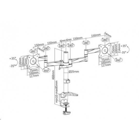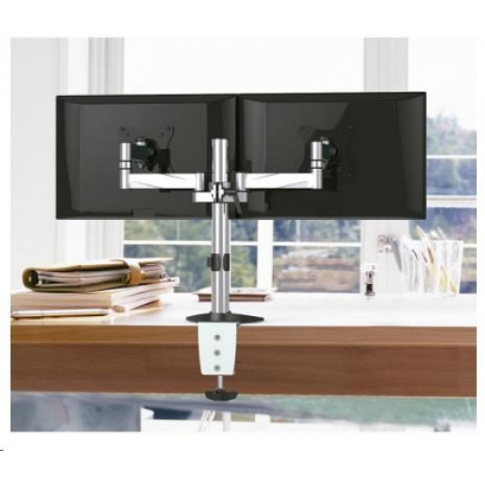 Kancelársky stolný držiak na 2 monitory Fiber Mounts M71C4 Stolný držiak na 2 monitory 13-27", otočný,/sklopný, výškovo nastaviteľný, funkcia pivot Stolný držiak na zavesenie 2 monitorov s uhlopriečkou 13 až 27". Plne nastaviteľný - otáčanie do strán, náklon, výškovo nastaviteľný, funkcia pivot, korekcia roviny obrazovky. Nosnosť 16kg, VESA štandard 75x75 a 100x100. Stolný držiak na 2 monitory v peknom dizajne. Fiber Mounts M71C4 je kvalitný a veľmi pekný stolný držiak na 2 monitory, plne nastaviteľnýStolný držiak na 2 monitory do kancelárie, pracovne alebo domácnosti Fiber Mount M71C4 Technické údaje: nosnosť 16kg (2x8kg) podporuje VESA štandard 75x75 a 100x100 odporúčame na monitory o veľkosti 13 až 27" obe ramená sú plne otočné do strán obe ramená umožňujú nastavenie vzdialenosti od nosníka funkcia PIVOT - horizontálne alebo vertikálne otáčanie obrazoviek korekcia roviny obrazoviek 2 typy uchytenia na stolovú dosku uchytenie na stolovú dosku o sile 10 až 85mm celková výška 400mm úchyty na káble farba strieborná, nosník chrómový záruka 2 roky