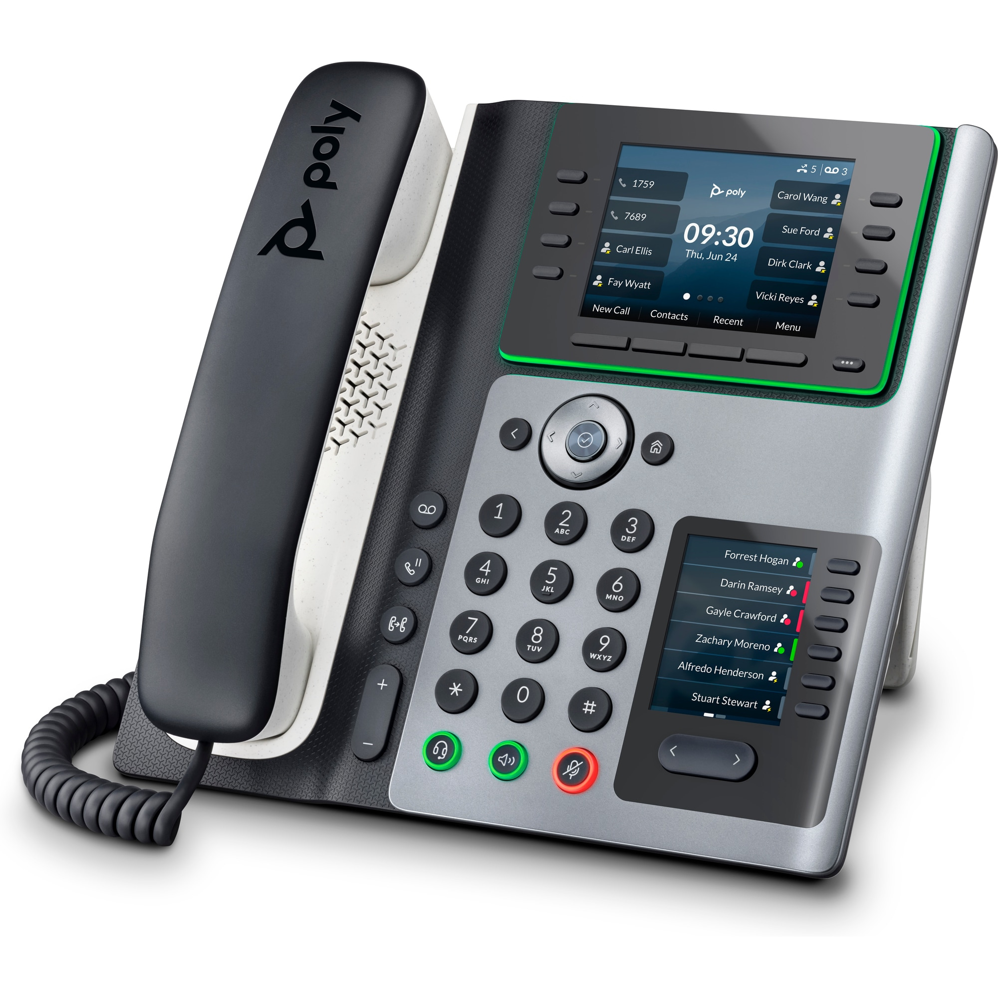 | Správa zabezpečenia | Podpora syntaxe URL s heslom; TLS (Transport Layer Security); Šifrovanie Wi-Fi: WEP, WPA-Personal, WPA2-Personal, WPA2-Enterprise s 802.1x (EAP-TLS, PEAP-MSCHAPv2); Šifrovanie médií SRTP pomocou 256-bitového šifrovania AES Poskytovanie prostriedkov Poly Zero Touch; Poly Lens; Cloudová správa služby správy zariadení Polycom pre poskytovateľov služieb (PDMS-SP); SDP Podpora znakov Unicode UTF-8; Nastaviteľný stojan na stôl (2 pozície); |