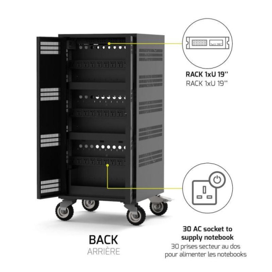 - Kapacita: až 30 notebookov do veľkosti 15,6 '' a 1x RACK U19"