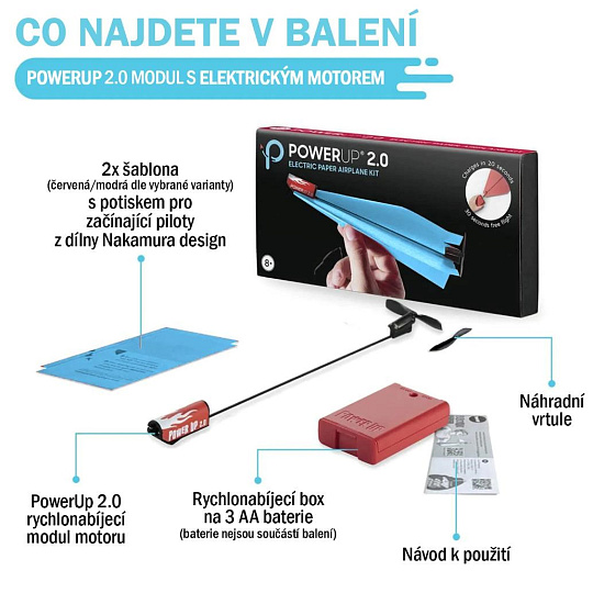 Vnútri balenia na vás čaká jedna pohonná jednotka PowerUp 2.0 doplnená o dve papierové šablóny, náhradnú vrtuľu, prenosný rýchlonabíjací box a podrobnú používateľskú príručku. Je tak ideálnym darčekom pre zvedavých letcov. Nezabudnite do nabíjacieho boxu pred letom vložiť 3 tužkové AA batérie (nie sú súčasťou balenia). Pre dosiahnutie skutočne dokonalého letového zážitku potom môžete kedykoľvek prikúpiť doplnkovú sadu šablón PowerUp Paper Templates Airframe (2.0/4.0). V tej nájdete kvalitné papiere s atraktívnymi motívmi rôznych lietadiel vrátane špeciálneho vodeodolného papiera pre hladké pristátia do vlhkej trávy.