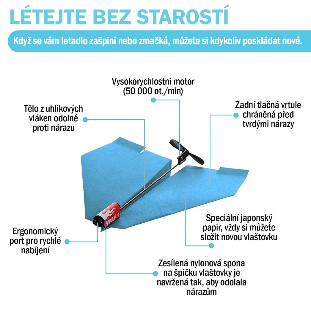 Tento set funguje bez zložitého nastavovania alebo mobilnej aplikácie. Stačí vyrobiť papierové lietadlo, pripevniť motorček, bleskovo nabiť a rovno hádzať. Spoločné lietanie zaručene zabaví deti aj dospelých a bude perfektným darčekom, ktorý hravou formou ukáže základné princípy aerodynamiky a fyziky.