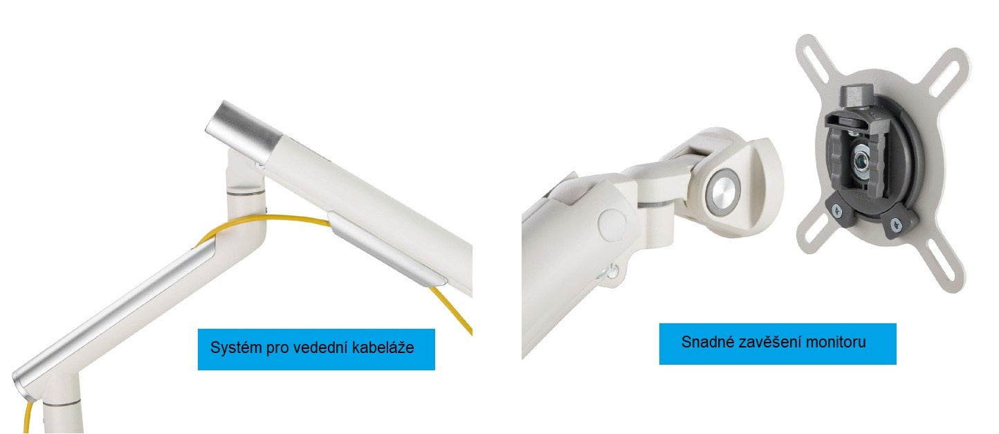Prémiový stolný držiak na monitor Fiber Mounts M4C37 Ergonomický polohovateľný držiak na monitory 17-32", VESA 75x75 a 100x100, nastavenie vzdialenosti monitora od stolového uchytenia, nastavenie výšky, otáčanie do strán, naklopenie, funkcia pivot, plynová pružina, nosnosť 9kg, 2 stolové úchyty, vedenie káblov, farba biela Kancelársky držiak prémiovej kvality a krásneho dizajnového spracovania v bielej farbe so striebornými krytmi. Držiak poskytuje najvyššiu ergonómiu - komplexnú nastaviteľnosť: výškové polohovanie, nastavenie vzdialenosti od stolového uchytenia, otáčanie do strán, naklopenie, funkcia pivot pre otočenie obrazovky na šírku alebo na výšku. Balenie obsahuje 2 typy uchytenia na stolové dosky: na okraje stolov alebo cez prechodku (1x otvor min. 10mm) kdekoľvek v priestore stola. Polohovanie je veľmi jednoduché a rýchle, pozíciu monitora môžete meniť podľa potreby x krát denne. Odporúčame aj veľmi náročným zákazníkom alebo do kancelárií, kde chcú poskytnúť zamestnancom skvelú ergonómiu a pohodlie pri práci, to všetko navyše v krásnom dizajnovom prevedení. Ergonomický držiak monitora v prémiovej kvalite Fiber Mounts M4C37 Technické údaje: nosnosť 9kg plynová pružina s nastavením podľa hmotnosti monitora odporúčaná uhlopriečka monitora 17-32" podpora VESA štandardov 75x75 a 100x100 výškové polohovanie 260mm minimálna výška 175mm, maximálna výška 435mm vzdialenosť monitora od stolového uchytenia 0-549mm funkcia pivot na nastavenie monitora na šírku alebo na výšku uchytenie na stolové dosky priemeru 10-80mm 2 typy uchytení na stoly: svorka na okraj stola a skrutka na prechodku (otvor min. 10mm) systém na vedenie káblov farebné prevedenie biele, krytky strieborné záruka 5 rokov Prémiový dizajnový držiak na monitory ergonomický do kancelárií Fiber Mounts M4C37 Držiak M4C37 podporuje VESA štandardy: VESA 75x75 VESA 100x100 možnosť zakúpenia aj s rozšírením na VESA 200x100 a 100x200 možnosť zakúpenia aj s rozšírením na VESA 200x200