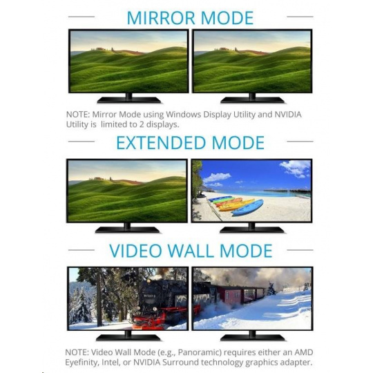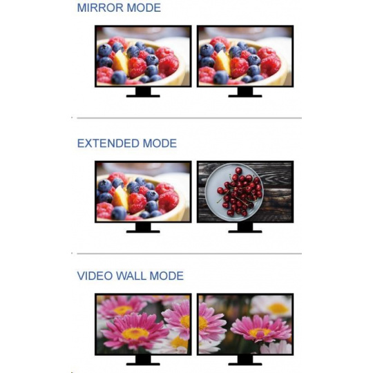 - Adaptér MST umožňuje používať tri režimy: 1.Prenos dvoch rôznych obrazov na dva monitory 2.Rozšírenie jedného obrazu na dve obrazovky 3.Zobrazenie dvoch rovnakých obrázkov na dvoch monitoroch