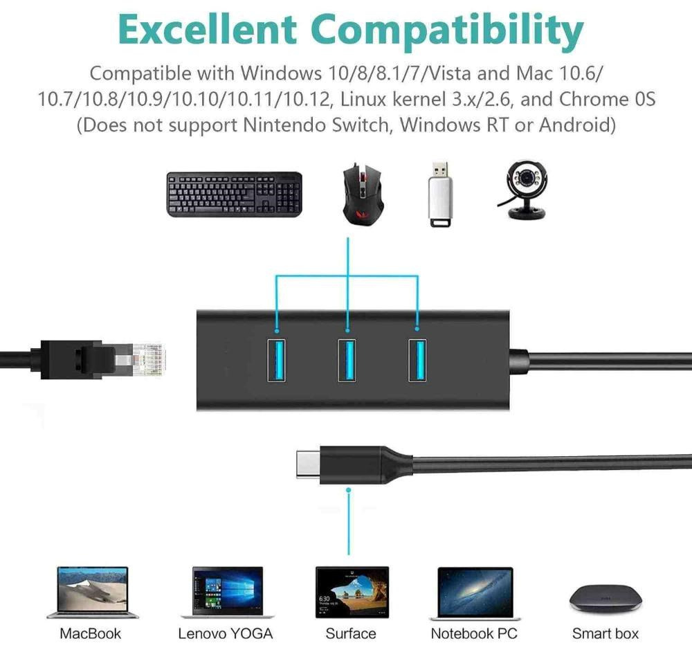 Převodník, který umožní připojit Váš počítač s portem USB typu C do internetu nebo k lokální síti pomocí kabelu s RJ45 a navíc umožňuje zapojit tři USB3.2 periferie jako USB disk, tiskárnu, klávesnici a myš