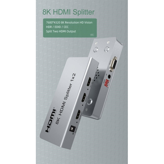 PremiumCord HDMI 2.1 splitter 1-2 porty, 8K@60Hz, 4K@120Hz, 1080p, HDR