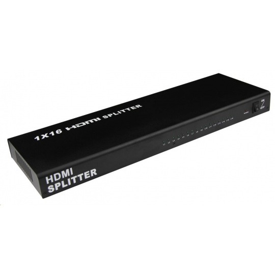HDMI Video Splitter 1 => 16 s externým napájaním, HDMI 1.kompatibilné s 4a max. rozlíšenie 1080i a 1080p. K jednému zdroju signálu HDMI môžete pripojiť viacero obrazoviek HDMI. - kompatibilný s DTV 480i, 480p, 720i, 720p, 1080i a 1080p - podpora VGA, SVGA, XGA a UXGA - HDMI 1.4a - Podporuje Full 3D - HDCP ready - LED indikácia stavu - Napájací adaptér 230 V súčasťou balenia - Prenáša obraz aj zvuk - Podporuje až 15 m kábla HDMI na vstupe a 25 m kábla HDMI na výstupe. (zosilňuje signál HDMI) - kovový kryt pre lepší odvod tepla Ak sa obraz nezobrazí ihneď po zapojení rozbočovača, počkajte približne 30 s, kým sa signál rozpozná...