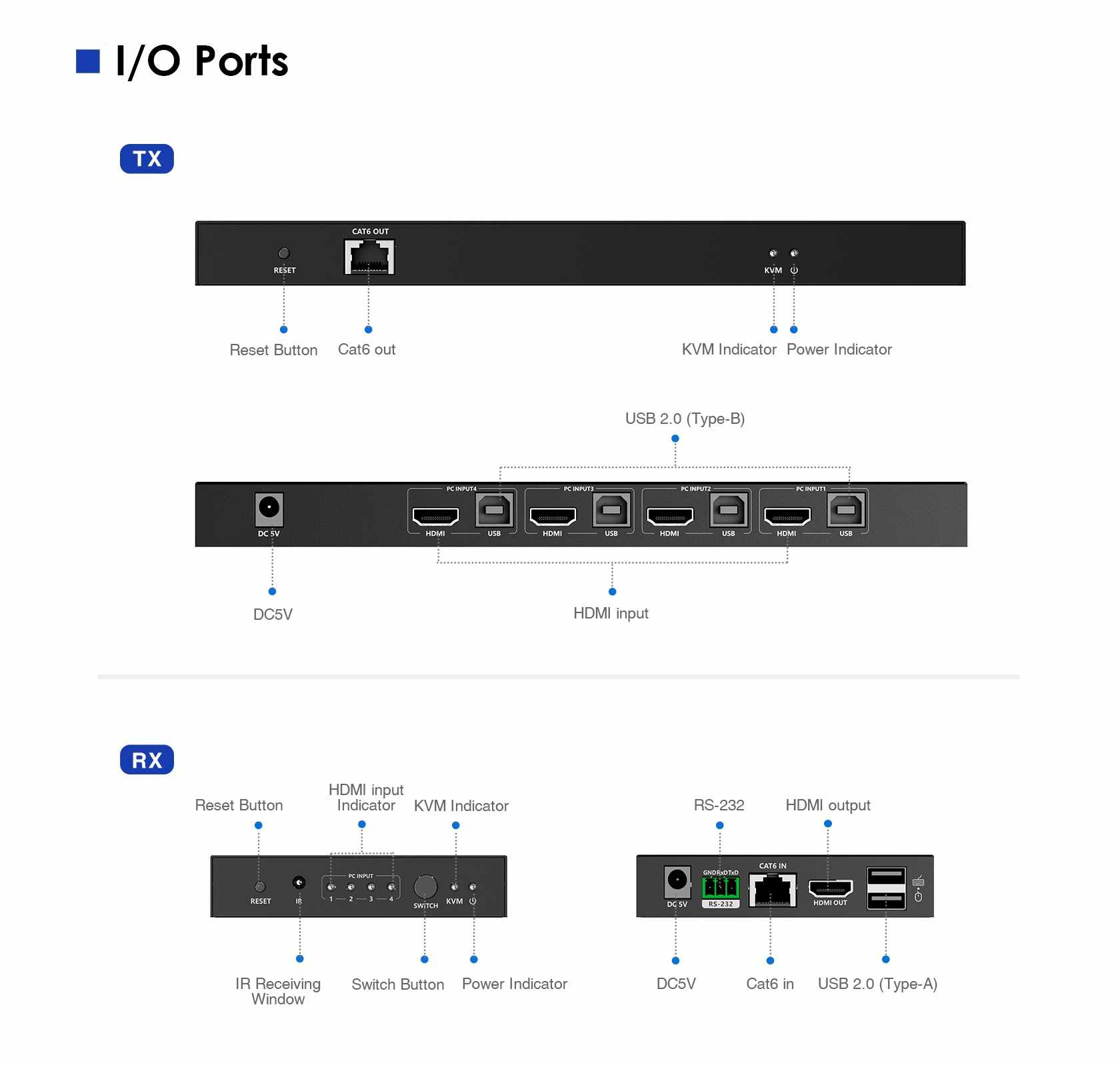 KVM prepínač umožňuje pripojiť až 4 servery alebo PC a ovládať ich na vzdialenosť až 70m pomocou HDMI monitora a USB klávesnice a myši.