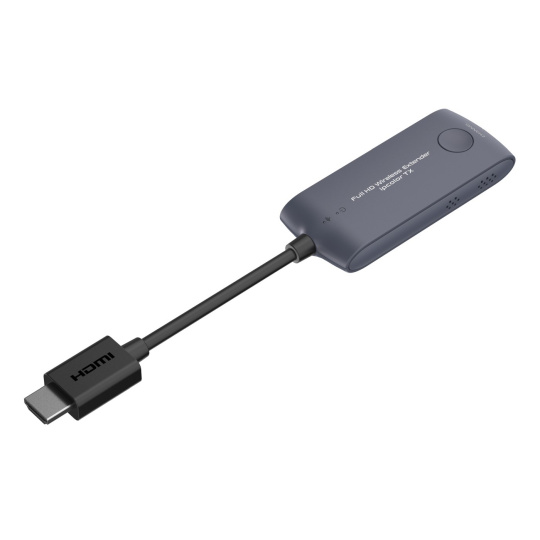 - Vysielač predstavuje malý dongle, ktorý sa zasúva priamo do konektora HDMI počítača, notebooku. Vysielač je napájaný pomocou USB kábla z USB portu.