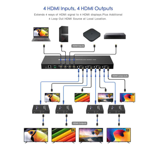 Umožní prepínať a prepojiť štyri zdroje HDMI signálu na 4 HDMI zobrazovacie zariadenia, monitory na veľkú vzdialenosť až 70m pomocou UTP kábla a navyše 4 lokálne monitory