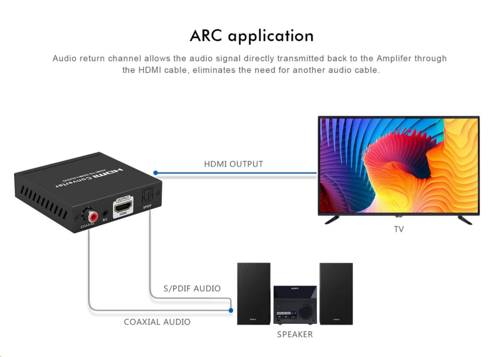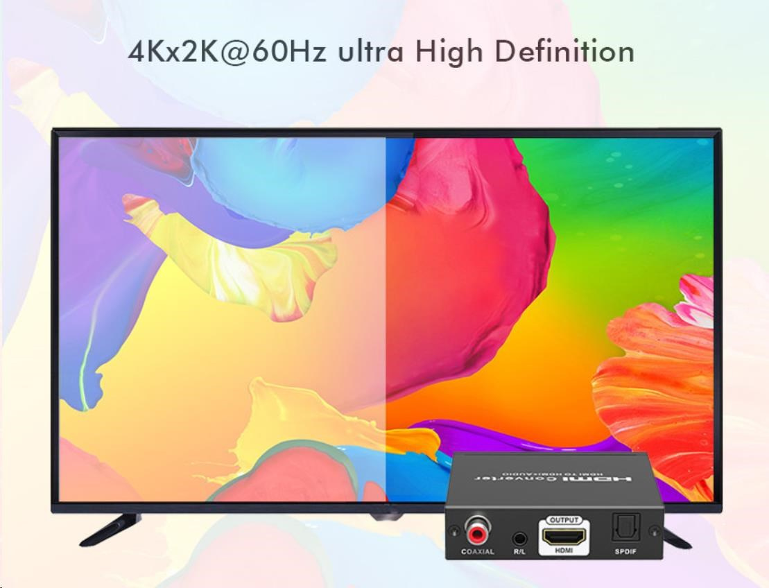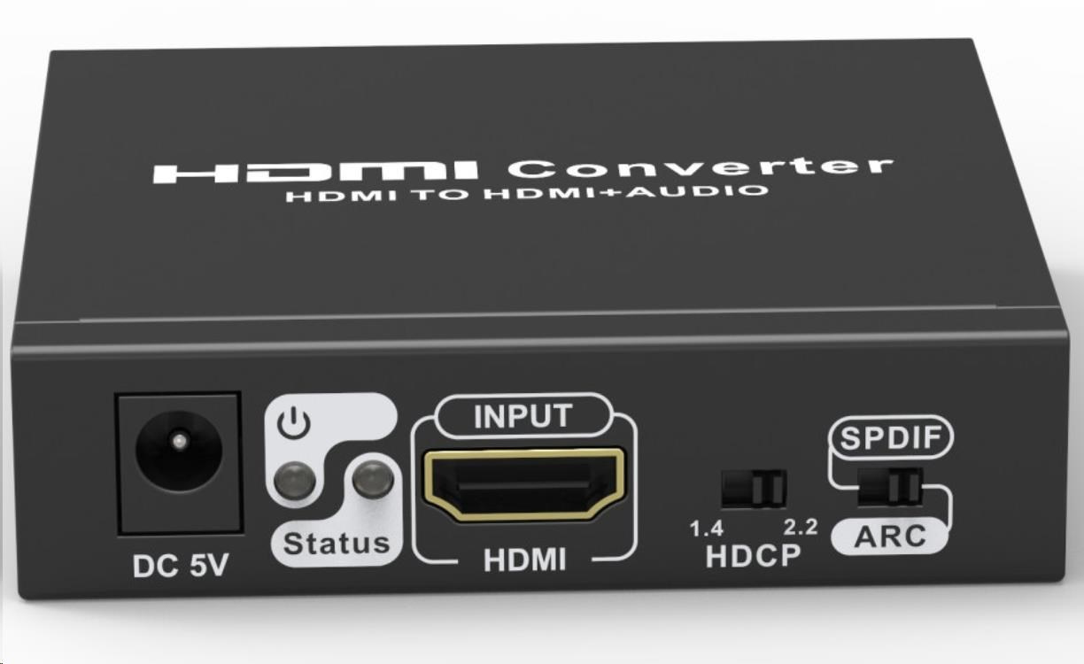 Umožňuje oddelenie zvuku z HDMI2.0 vstup na analógový/digitálny zvuk, ktorý je samostatne vyvedený do konektorov: stereo jack, digitálny audio RCA CINCH alebo digitálny optický TOSLINK (SPDIF)