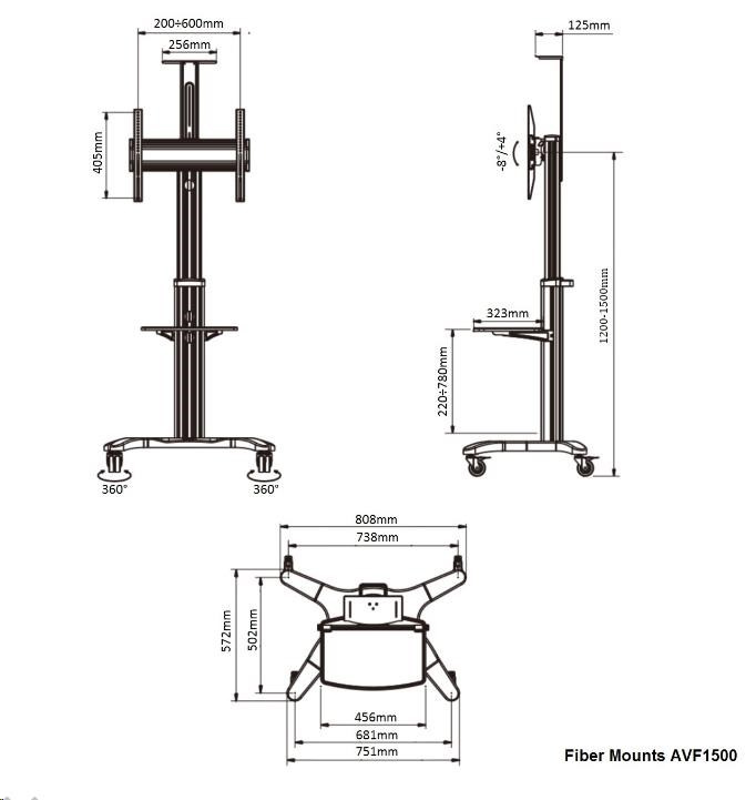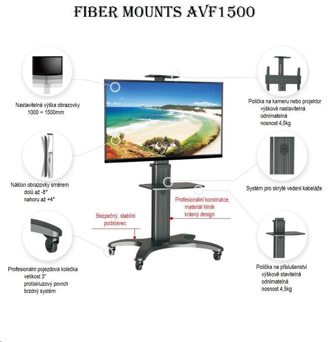 Technické údaje: •maximálne zaťaženie 36,4kg •podporuje VESA štandardy 200x100 až 600x400 •na TV 32" až 60" •min. výška stojanu 1200mm •max. výška stojanu 1500mm • náklon obrazovky +4° až -8° •polica na príslušenstvo - súčasť balenia •polica na kameru - súčasť balenia •profesionálna konštrukcia - top kvalita •pojazdové kolieska s brzdou •dokonale stabilný •materiál hliník •farebné prevedenie čierne •záruka 5 rokov Televízny stojan AVF1500 podporuje VESA štandardy: •VESA 200x100 •VESA 200x200 •VESA 300x200 •VESA 300x300 •VESA 400x200 •VESA 400x300 •VESA 400x400 •VESA 600x400