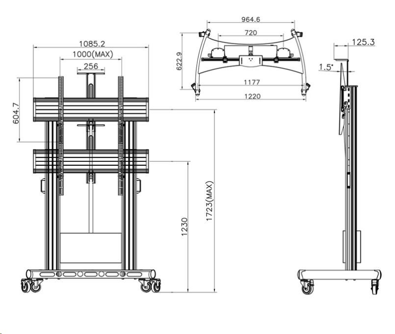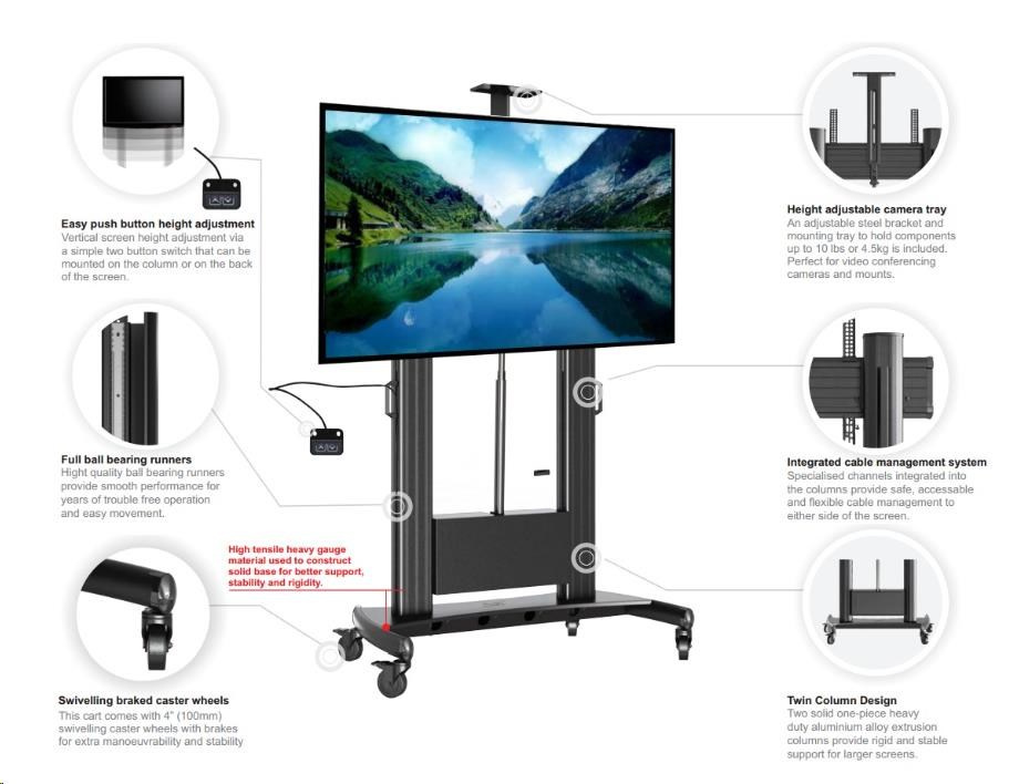 Technické údaje: •nosnosť 50kg •VESA štandard držiaku na TV 100x100 až 740x460 •nastaviteľná výška televízie 130cm až 195cm (výška po stred TV) •náklon obrazovky nahor až 6,5° a nadol až 12° •možnosť zakúpenia police na príslušenstvo •možnosť zakúpenia priečok na katalógy •systém vedenia kabeláže telom nosníka •kvalitné pojazdové kolieska s brzdou (možnosť zakúpenia nepojazdnej verzie bez koliesok) •výborná stabilita a bezpečnosť •certifikát TUV GS •záručná doba 10 rokov