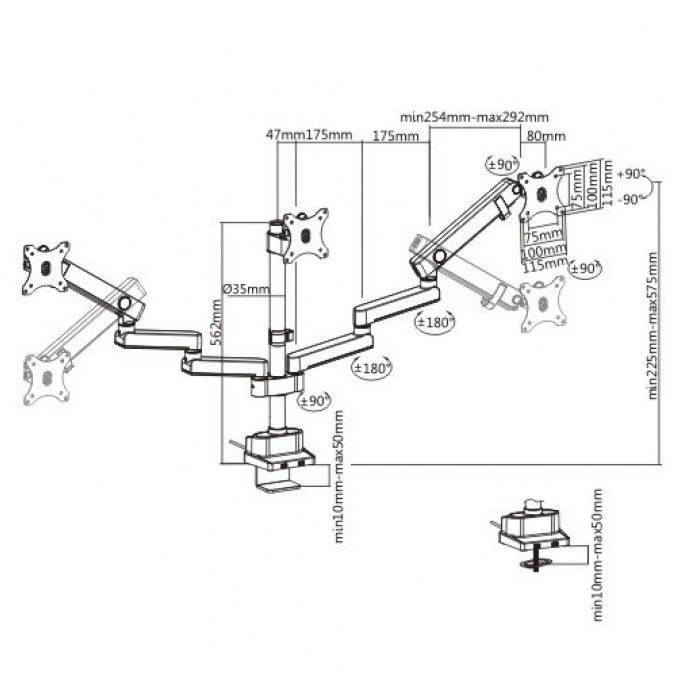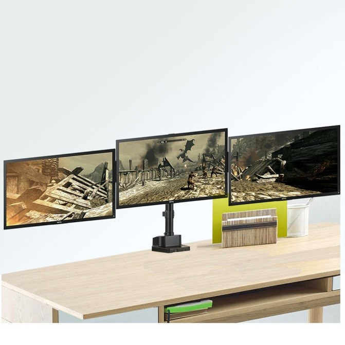 Profesionálny stolný držiak na 3 monitory Fiber Mounts M8C11 Plne nastaviteľný kancelársky držiak na zavesenie troch monitorov 15-29", profesionálne spracovanie, VESA 75x75 a 100x100, nosnosť 21kg Profesionálny systém na upevnenie a plnohodnotné polohovanie troch monitorov - otáčanie do strán, sklon, dĺžkové nastavenie, rotácia obrazoviek. Držiak podporuje VESA štandardy 75x75 a 100x100. Maximálna hmotnosť monitora 7kg (celkovo 21kg). Držiak splní požiadavky každého používateľa. Profesionálny stolný držiak do kancelárie na 3 monitory Fiber Mounts M8C11 Technické údaje: celková nosnosť 21kg (3 x 7kg) podpora VESA štandardu 75x75 a 100x100 odporúčané uhlopriečky monitorov 15" až 29" výškové polohovanie každého ramena 225mm až 575mm rotácia obrazoviek - možnosť nezávislého otáčania každého monitora na šírku alebo na výšku nastavenie vzdialenosti krajného monitora možnosť nastavenia monitorov do príčky alebo do paraboly upevnenie na stolovú dosku o priemere 10mm až 50mm stolový úchyt má integrované prípojky USB 3.0 systém vedenia káblov materiál hliník a oceľ farebné prevedenie čierne záruka 5 rokov Stolný držiak na 3 monitory Fiber Mounts M8C11 Držiak na 3 monitory M8C11 podporuje VESA štandardy: VESA 75x75 VESA 100x100 Profesionálny držiak na tri monitory s plnohodnotným polohovaním. Držiak je vhodný do kancelárií, pracovní, firiem ale aj domácností.