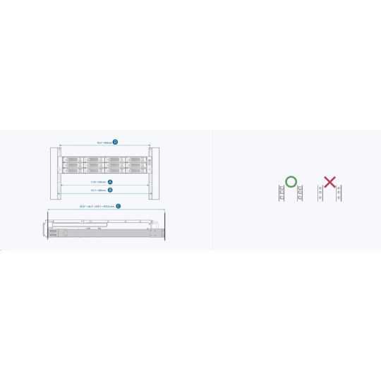 - Vzdialenosť medzi dvoma rackovými stĺpmi (meranie štvorcových otvorov racku stred-stred) je 18,3" (465 mm)