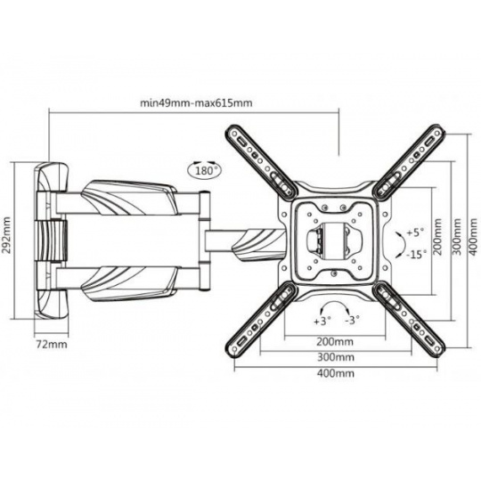 Nástenný oceľový držiak pre LCD monitory a televízory s uhlopriečkou 23"- 55" (58-140 cm) a maximálnou hmotnosťou 35 kg. 3x záves, vertikálne výklopný +5°/-15° a horizontálne otočný +90°/-90°, vzdialenosť od steny 49-615 mm, materiál oceľ, farba čierna. Montáž VESA: 75x75, 100x100, 100x200, 200x200, 300x200, 300x300, 400x200, 400x300, 400x400...
