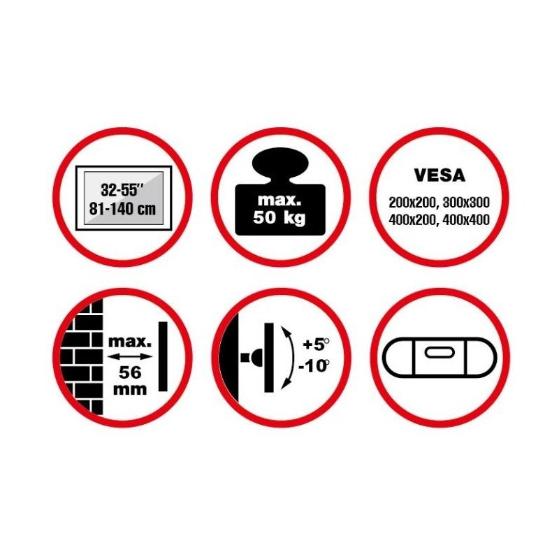 Nástenný oceľový držiak na Plasma a LCD TV s uhlopriečkou 32"- 55" (81-140cm) a hmotnosťou maximálne 50kg. Konzola na zavesenie TV s vodováhou, vertikálne výklopný +5°/-10°, vzdialenosť od steny 56mm, materiál oceľ, cenovo výhodný, farba čierna. Uchytenie VESA: 200x200, 400x200, 300x300, 400x400.