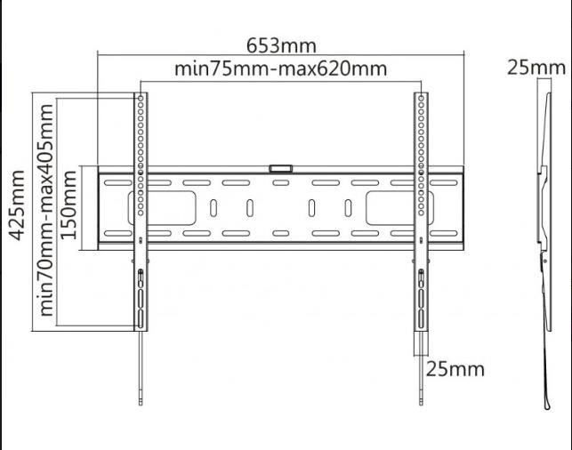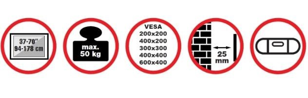 Nástenný oceľový držiak na Plasma a LCD TV s uhlopriečkou 37"- 70" (94-178cm) a hmotnosťou maximálne 50kg. Konzola na zavesenie TV s vodováhou, nie je vertikálne výklopná, vzdialenosť od steny 25mm, materiál oceľ, cenovo dostupné, farba čierna. Uchytenie VESA: 200x200, 400x200, 300x300, 400x400, 600x400.