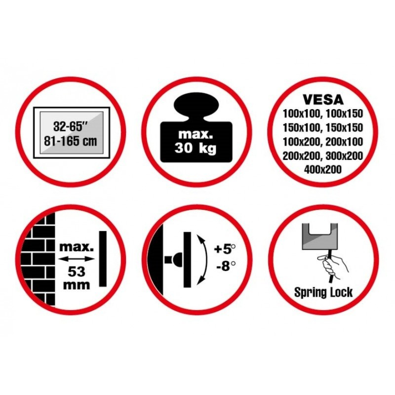Nástenný oceľový držiak na OLED TV s uhlopriečkou 32"- 65" (81-165cm) a hmotnosťou maximálne 30kg. Konzola na zavešenie TV s vodováhou, vertikálne výklopný +5°/-8°, vzdialenosť od steny 53mm, materiál hliník/oceľ, zámok Spring Lock so šnúrou, mäkká podložka, farba čierna. Uchytenie VESA: 100x100, 100x150, 150x150, 200x100, 200x200, 300x200, 400x200.