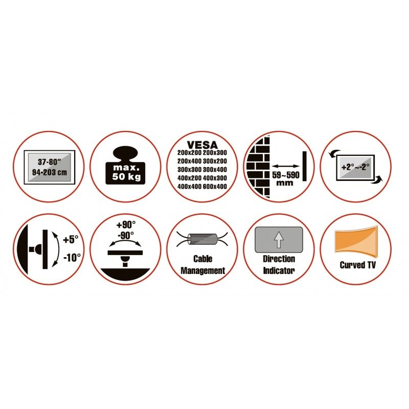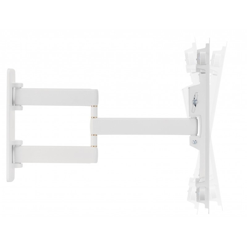 Nástenný oceľový držiak s bočným natáčaním na TV s uhlopriečkou 37"- 80" (109-203cm) a hmotnosťou maximálne 50kg. VESA max 600x400, 3x pant, vertikálne výklopný +5°/-10° a horizontálne otočný +90°/-90°, vzdialenosť od steny 59-590mm, Cable Managment, farba biela. Uchytenie VESA: 200x200, 300x200, 400x200, 300x300, 400x300, 400x400, 600x400. Direction indikátor, jemné nastavenie polohy oproti fixácii na stene +2°/-2°, rozmery 590 x 730 x 445 mm.