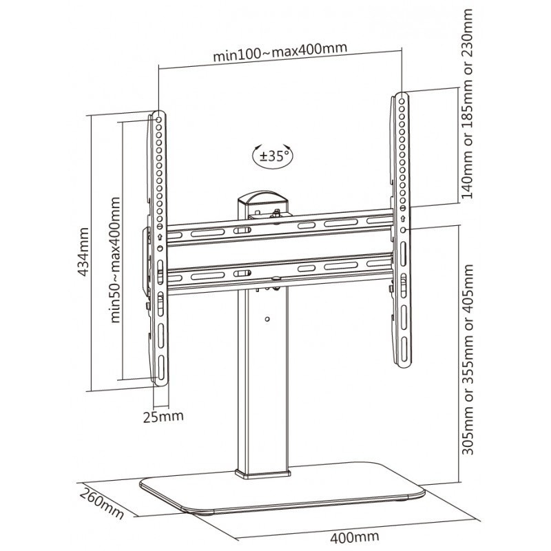 Televízny stojan na nábytok pre veľké TV s uhlopriečkou 32"- 55" (81-140cm) a hmotnosťou maximálne 40kg. Stredový nosný profil na sklenenej ploche, výška vrátane TV 142,5-152,5cm, držák vertikálne výklopný +0°/-35° a otočný +35°/-35°, rozmery 43x28x67cm, materiál sklo/oceľ, farba čierna. Uchytenie VESA: 100x200, 200x100, 200x200, 300x200, 300x300, 400x200, 400x400.