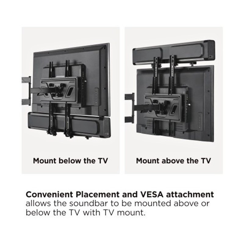Držiaky na reproduktor pod alebo nad TV - predlžujú jeho držiak, 2ks - výsuvné 4-18,2cm, rozmery zvukového zariadenia môžu byť 40x182mm s šírkou 508-1143mm, maximálne zaťaženie 15 kg, kombinácia ocele a plastu, farba čierna.