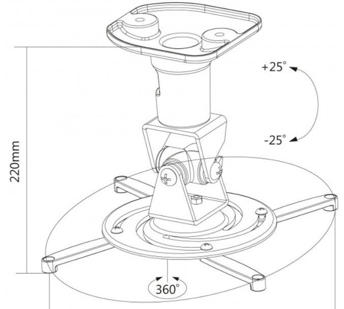 Stropný držiak na dátové projektory - vzdialenosť od stropu 22 cm, prístroj je možné otočiť o 360° a nakloniť +/-25°, maximálne zaťaženie 15 kg, káblový prechod, vhodné aj na uchytenie na šikmé plochy, biela. Univerzálny systém uchytenia dátových projektorov (rozsah 18-31 cm).
