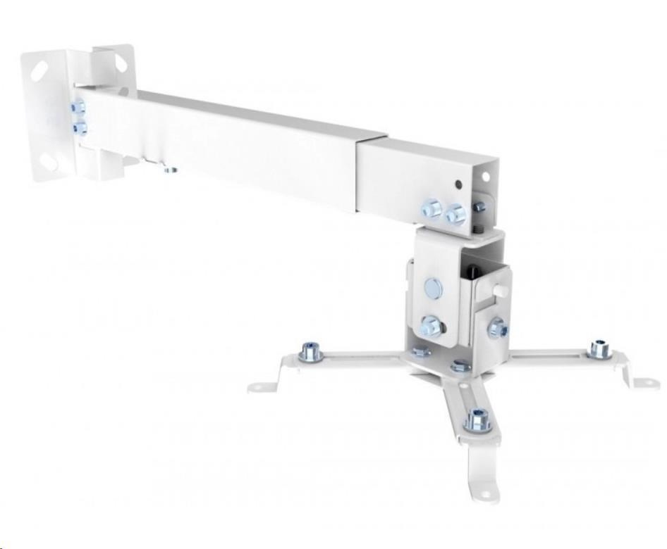 Stropný a nástenný držiak na dataprojektory - vzdialenosť od stropu 43-65cm alebo steny 35-56cm, prístroj nie je možné otáčať, je možné nakloniť +/- 8° bočne a +/- 15° v smere, maximálna záťaž 20kg, biela. Univerzálny systém uchytenia dataprojektorov (rozsah 22,5-31,5 cm).