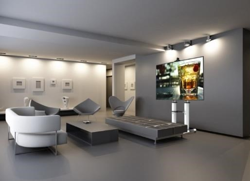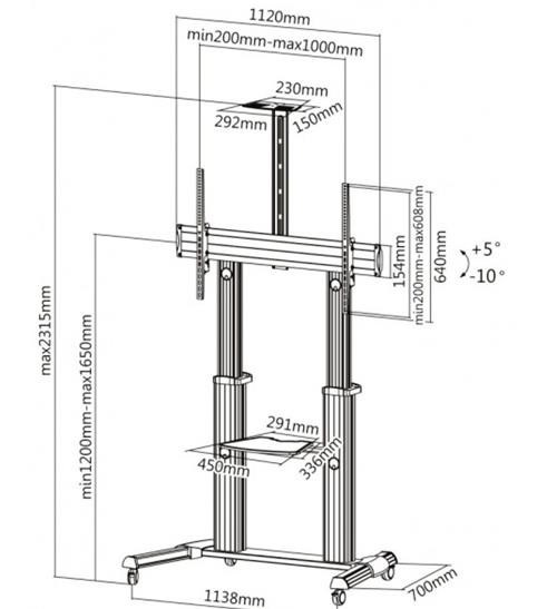 Moderné televízne stolíky na Plasma a LCD TV s uhlopriečkou 60"- 100" (152-254cm) a hmotnosťou maximálne 100kg. 2x teleskopická nosná tyč na kolieskach, držák otočný o 90° a vertikálne výklopný +5°/-10°, horná výškovo nastaviteľná plocha pre kameru, polička, AluDesign, farba strieborná. Uchytenie VESA: 200x200, 300x300, 400x200, 400x400, 600x400, 800x400, 800x600, 1000x600.