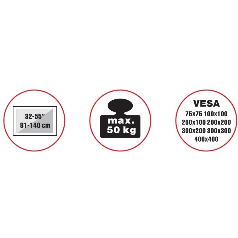 Prenosný stolík na veľké TV s uhlopriečkou 32"- 55" (81-140cm) a hmotnosťou maximálne 50kg. Výklopná konštrukcia s aretáciou polohy na kolieskach, pevný držiak na vertikálne aj horizontálne uchytenie, po sklopení ideálny na prepravu, rozmery 44x46,5x103cm, materiál oceľ, farba čierna. Uchytenie VESA: 75x75, 100x100, 200x100, 200x200, 300x200, 300x300, 400x200, 400x400.