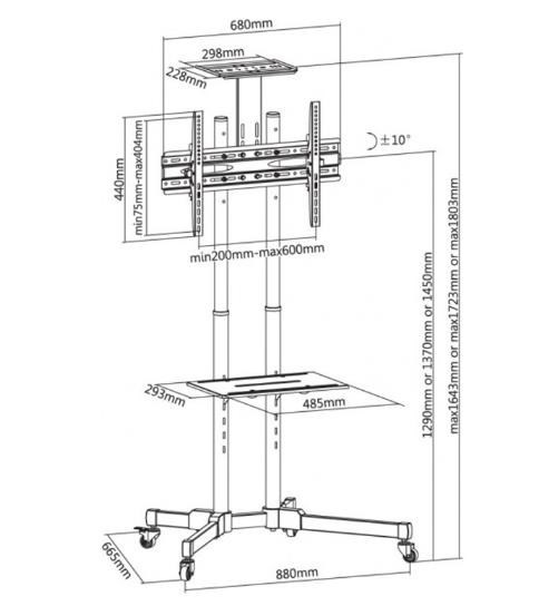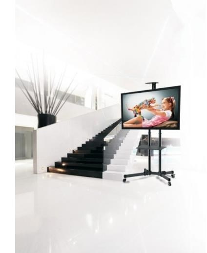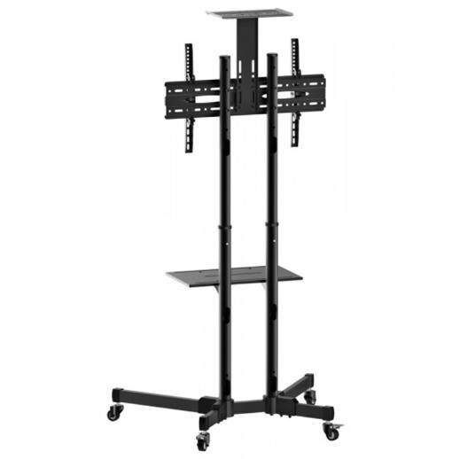 Televízny stolík na Plasma a LCD TV s uhlopriečkou 37"- 70" (94-178cm) a hmotnosťou maximálne 50kg. 2x stredová nosná tyč na kolieskach, držiak vertikálne výklopný +10°/-10°, horná výškovo nastaviteľná plocha pre kameru, polička, materiál oceľ, farba čierna. Uchytenie VESA: 200x200, 300x300, 400x200, 400x400, 600x400.