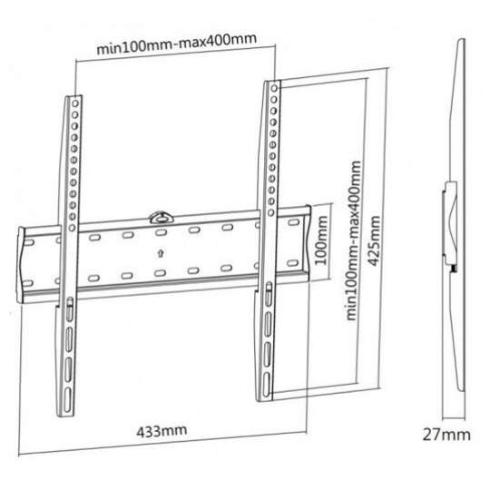 Nástenný oceľový držiak SLIM s minimálnou vzdialenosťou od steny na Plasma a LCD TV s uhlopriečkou 32"- 55" (81-140cm) a hmotnosťou maximálne 40kg. Stredová konzola na zavesenie TV s upevnenými držiakmi, nie je vertikálne výklopný, vzdialenosť od steny 27mm, vodováha, materiál oceľ, farba čierna. Uchytenie VESA: 200x200, 300x300, 400x200, 400x400.