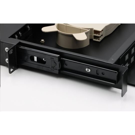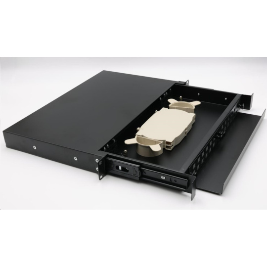 19" rozvádzač, výška 1U, pre 24 simplex adaptérů SC alebo duplexných LC, farba čierna, kovová skrinka, kazeta na zvarky. Van sa vysúva pomocou posuvných koľajníc.