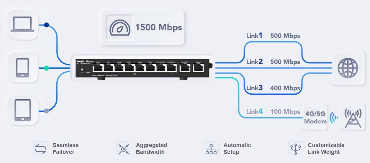 Popis produktu Ruijie RG-EG310GH-P-E je kabelový Gigabitový router s PoE, dostatečným VPN výkonem pro obsloužení poboček a vzdáleně pracujících pracovníků v rámci firmy. Bezpečný a spolehlivý router s vlastním webovým managementem, možností správy přes Ruijie Cloud odkudkoliv, blokování obsahu podle typu aplikace, inteligentní Multi-WAN load balancing s možností využít až 4 WAN porty zároveň. Router nabízí 1 Gigabitovými WAN port, 6x Gigabit LAN, 3 Gigabitový LAN/WAN porty, celkový výkon v NATu 1.5 Gbps a 802.3af/at PoE na prvních 8 portech s celkovým PoE budgetem 130W. Router pro přístup do lokální sítě umožňuje i několik možností VPN serverů a to konkrétně: IPsec, PPTP, L2TP a OpenVPN. Limity VPN • IPsec: 230 Mbps, max. 64 tunelů • L2TP: 640 Mbps, max. 64 tunelů • OpenVPN: 100 Mbps, max. 64 tunelů Obsah balení • Zařízení • Napájecí adaptér 52V / 2.4A • Napájecí kabel Technické parametry Konektory a rozhraní Rychlosti WAN:(1) 10/100/1000Mbps Možnost více WAN:Ano Rychlost LAN:(6) 10/100/1000Mbps + (3) 10/100/1000Mbps LAN/WAN Gigabit LAN:Ano Napájení Typ napájení:DC konektor Typy PoE:PoE-Out (pouze) Podporované PoE-Out standardy:802.3af, 802.3at Počet PoE Out portů:8 PoE budget [W]:110 Max. spotřeba energie [W]:130 Napájení přes konektor/svorkovnici:54V / 2,4A Fyzické charakteristiky Provedení:Desktop Ventilátory:Bez ventilátoru Šasi:Kovové Tlačítka:Reset Provozní teplota [°C]:0 až 40 Šířka [mm]:202 Výška [mm]:28 Hloubka [mm]:108 Hardware Frekvence CPU [MHz]:1350 Počet CPU jader:2 Obecné Propustnost NAT [Mb/s]:1500 Propustnost VPN IPsec VPN [Mb/s]:230 Software Podporované VPN:PPTP, L2TP, IPSec, OpenVPN Web management:Ano Management:Webové rozhraní, Ruijie cloud Podpora IPv6:Ano Výchozí IP adresa:192.168.110.1 Výchozí jméno a heslo:Nastavuje se při prvním spuštění.