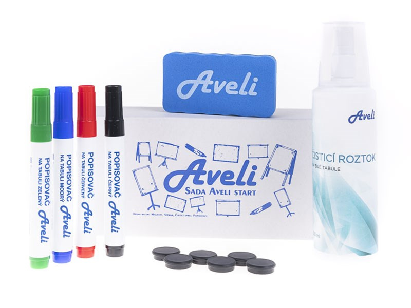 Základná súprava pomôcok na fixky. Sada obsahuje: 4 farebné fixky na biele tabule, 250 ml čistiaceho spreja, 6 okrúhlych magnetov s priemerom 24 mm, 1 magnetickú stierku...